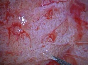 Figure 2. Using an operating microscope at x25 magnification tubular dissection is undertaken of the most dilated and opaque tubules.